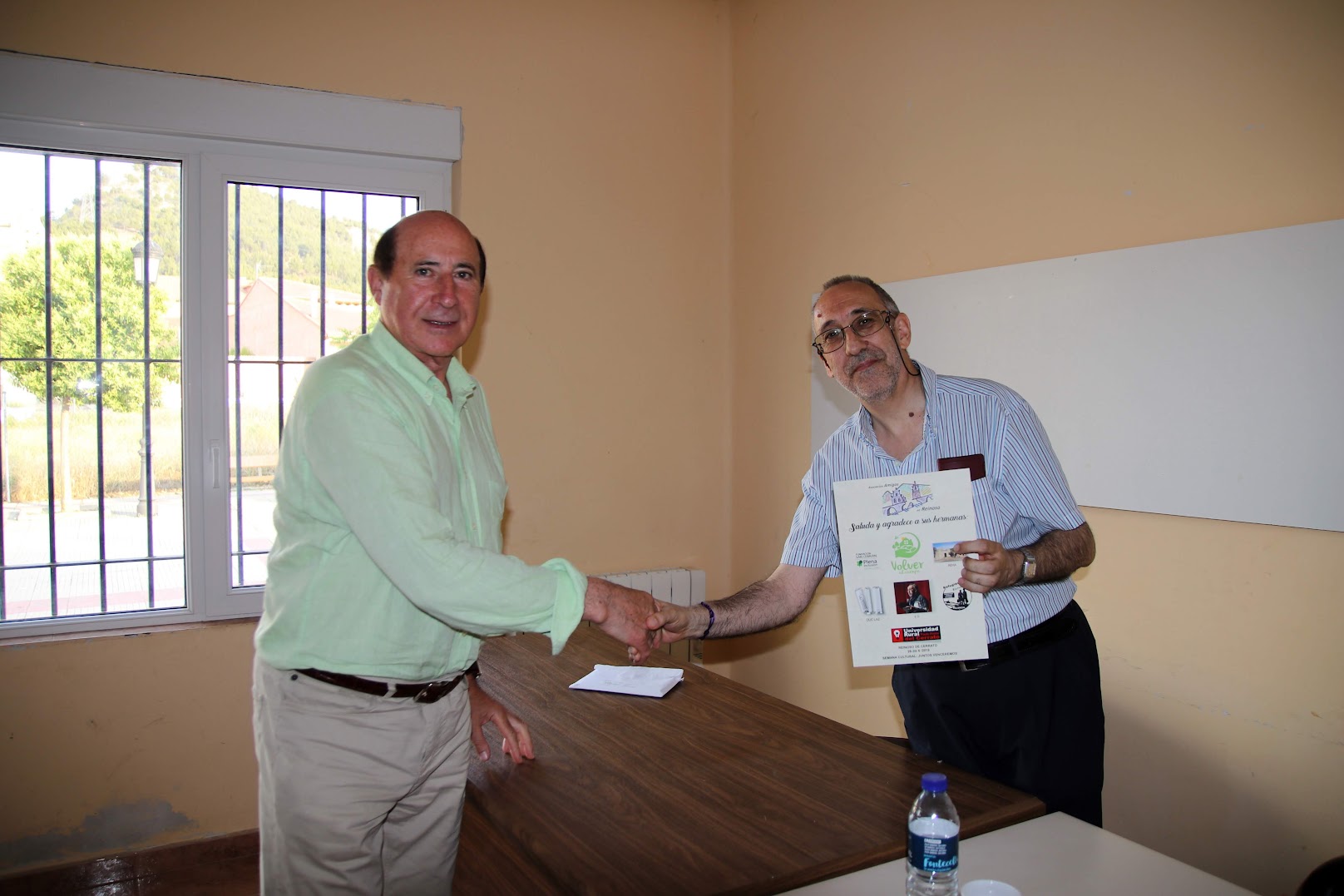 D.Jose Luis Ayuso "Alcalde de Reinoso entregando el reconocimiento a D, Fernando Pastor "periodista" por su participación en la semana cultural de la asociación AMIGOS DE REINOSO año 2019